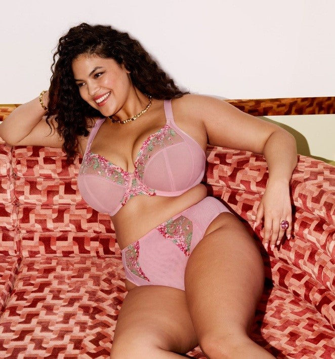 The Elomi Aerith Plunge Bra in Rose at Bras Galore Experience romance reimagined with all-new Aerith. The pretty floral embroidery blossoms in hues of pastel pink and greens, printed onto soft metallic yarns, for a sugar-frosted look. Teamed with a blush pink base, the UW Plunge Bra combines the same great fit of Matilda, with Reja’s softly wrapped underband, for ultimate style and comfort.