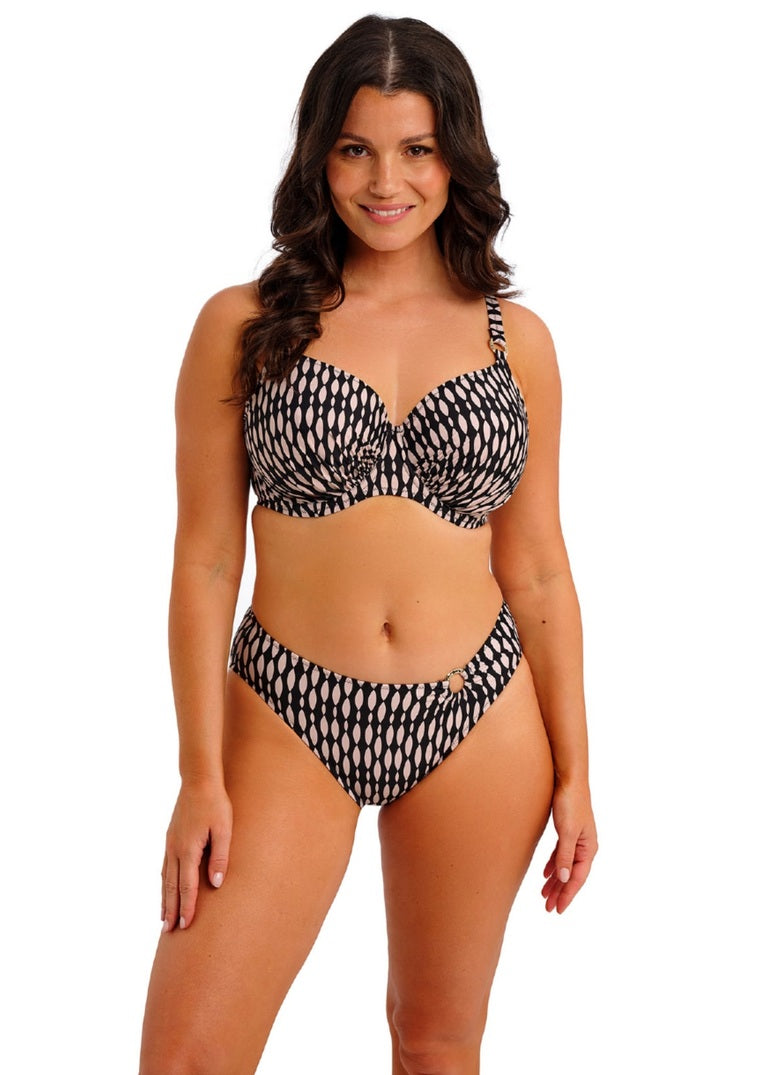 The Fantasie Shell Bay Mid Rise Bikini Brief - Desert Blush at Bras Galore New for spring/summer, feel supported and sun-ready with Shell Bay. Featuring a graphic design, in a black and muted blush pairing, for an elevated pool side look. Subtle design details complete this collection with its hammered effect gold ring detailing. For swimwear that feels as good as it looks – choose Fantasie Swim.